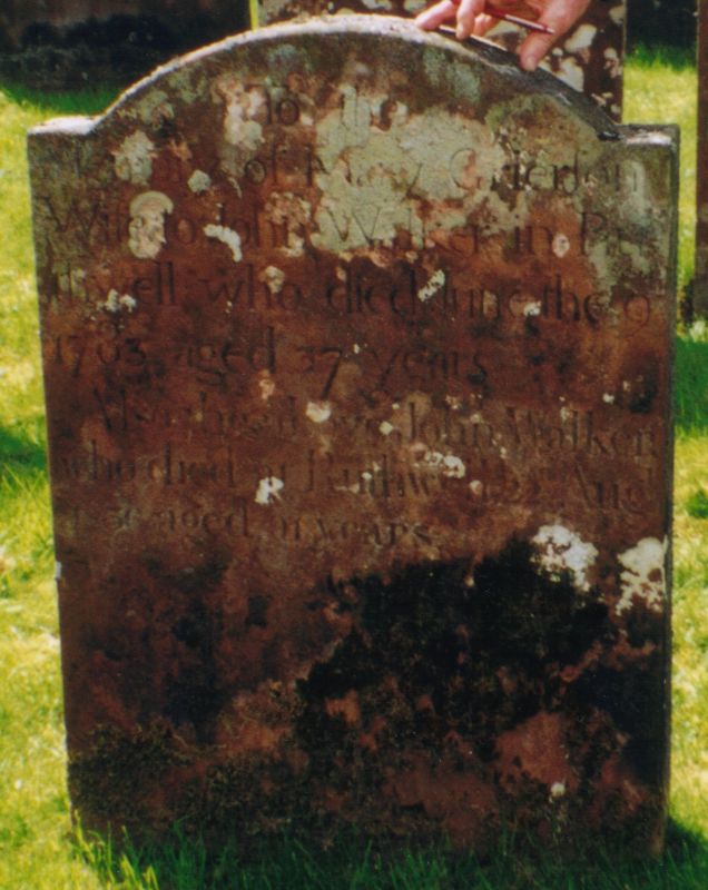 Inscription: Mary Grierson wife to John Walker in Ruthwell, who died 9th June 1783 aged 37 years. Also John Walker who died 22nd April 1836 aged 91 years.3  Marker, John Walker (1745-1836) and Mary Grierson (1746-1783). Cummertrees Churchyard.