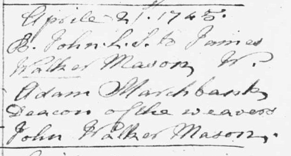 | Birth | John Walker was born on 21 April 1745, in Dumfriesshire, ScotlandG. April 21 1745 / B. John L.S. to James / Walker Mason W. / Adam Marchbank / Deacon of the Weavers / John Walker Mason.2,1,3 Old Parish Records, Birth of John Walker to James Walker. Scotlands People. |
