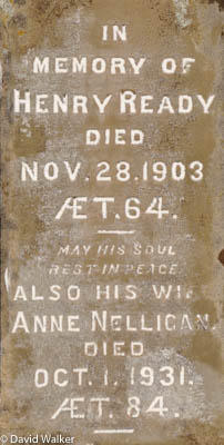 Inscription: In / Memory of / Henry Ready / Died / Nov. 28. 1903 / ÆT. 64. / -- / May his soul / Rest in peace / Also his wife / Anne Nelligan / Died / Oct. 1. 1931. / ÆT. 84.Left: Also their daughter / Margaret Ready / Died / July 4. 1934 / ÆT. 63.3  Tombstone, Henry Ready (1838-1903), his wife Anne Nelligan (1844-1931), their daughter Margaret Ready (1869-1934) St. Simon & St. Jude Roman Catholic Cemetery, Tignish, Prince County, Prince Edward Island, Canada.  Front inscription.  Left inscription.