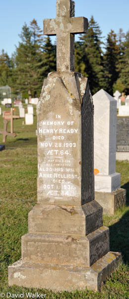 - [S10834] Cemetery Marker, St. Simon & St. Jude Roman Catholic Cemetery, Tignish, Prince County, Prince Edward Island, Canada. Henry Ready & Anne Nelligan, tombstone inscription & photograph; read by David A. Walker, 24 September 2015.