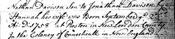 | Birth | Nathan Davison was born on 23 September 1758, in Preston, New London County, ConnecticutG.1 Birth record, Nathan Davison. |