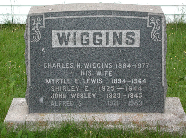 | Burial | He was buried on 19 September 1945 in the United Church Cemetery, Youngs Cove, Queens County, New Brunswick, CanadaG. Inscription: WIGGINS / Charles H. Wiggins 1884 - 1977 / His Wife / Myrtle E. Lewis 1894 - 1964 / Shirley E. 1925 - 1944 / John Wesley 1923 - 1945 / Alfred S. 1921 - 1983.2,1 Tombstone, Charles H. Wiggins (1884-1977), his wife Myrtle E. Lewis (1894-1964), their children Shirley E. (1925-1944), John Wesley (1923-1945) and Alfred (1921-1983). Ynited Church Cemetery, Youngs Cove, Queens County, New Brunswick, Canada. |