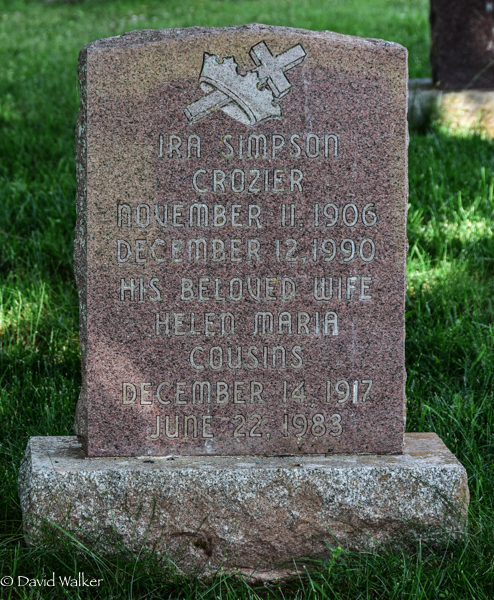 Inscription: Ira Simpson / Crozier / November 11 1906 / December 12, 1990 / His Beloved Wife / Helen Maria / Cousins / December 14, 1917 / June 22, 1983Back: CROZIER / Blessed are the / dead which die / in the Lord.2,4  Marker, Ira Simpson Crozier (1906-1990), his wife Helen Maria Cousins (1917-1983). Church of Scotland Cemetery, Wilmot Valley, Prince County, Prince Edward Island, Canada.