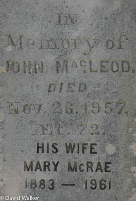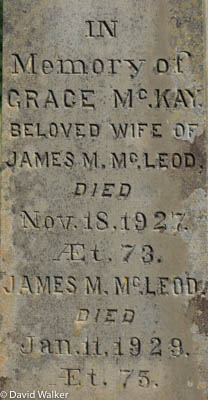 | Principal 2 | She witnessed the burial of Capt. John M. MacLeod and Johanna MacKay in the Peoples Cemetery, New London, Queens County, Prince Edward Island, Canada, 46.46332, -63.51671G.1,2 Marker, Capt. John McLeod (1820-1897), his wife Johanna (1813-1900), their son James M. McLeod (1853-1929), his wife Grace McKay (1854-1927), their son Duncan (1897-1898), John MacLeod (1885-1957), his wife Mary McRae (1883-1961). Peoples Cemetery, New London, Queens County, Prince Edward Island, Canada.  Front inscription detail.  Left inscription detail.  Right inscription detail.  Back inscription detail. |