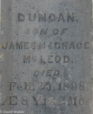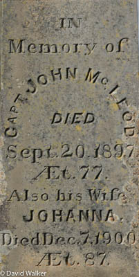 - [S11833] Cemetery Marker, Peoples Cemetery, New London, Queens County, Prince Edward Island, Canada. Capt. John MacLeod family plot, photograph & inscription; read by David A. Walker, 21 August 2017.