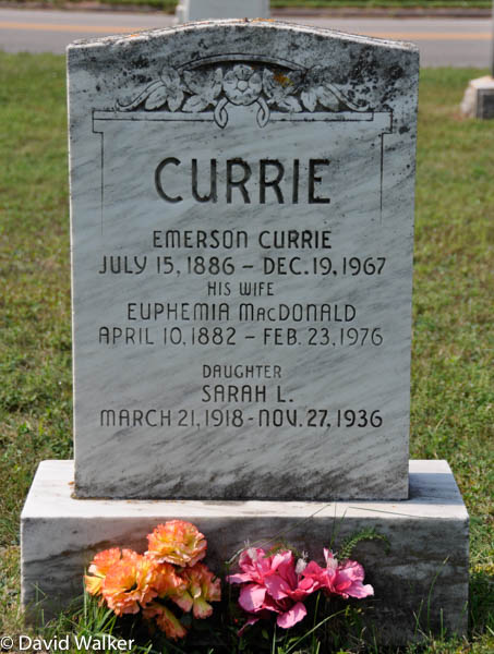 Inscription: CURRIE / Emerson Currie / July 15, 1886 - Dec. 19, 1967 / His Wife / Euphemia MacDonald / April 10, 1882 - Feb. 23, 1976 / Daughter / Sarah L. / March 21, 1918 - Nov. 27, 1936.1  Tombstone, Emerson Currie (1886-1967), his wife Euphemia MacDonald (1882-1976), their daughter Sarah (1918-1936). United Church Cemetery, Elmsdale, Prince County, Prince Edward Island, Canada.