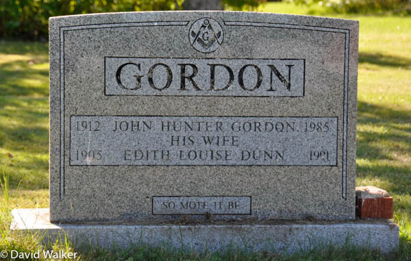 Inscription: GORDON / 1912 John Hunter Gordon 1985 / His Wife / 1905 Edith Louise Dunn 1991.2  Tombstone, John Hunter Gordon (1912-1985), his wife Edith Louise Dunn (1905-1991). Hillcrest Cemetery, Alberton, Prince County, Prince Edward Island, Canada.