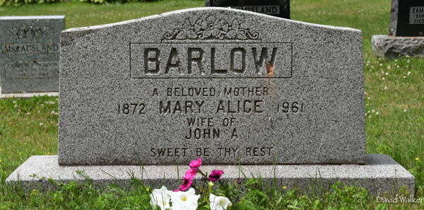 | Interred | She was buried in the plot of Robert Sterling Barlow, in the Peoples Cemetery, Summerside, Prince County, Prince Edward Island, Canada, 46.406848, -63.775895G.