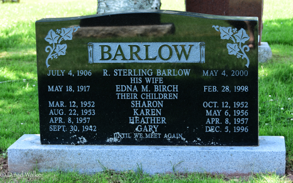 Inscription: BARLOW / July 4, 1906 R. Sterling Barlow May 4, 2000 / His Wife / May 18, 1917 Edna M. Birch Feb. 28, 1998 / Their Children / Mar. 12, 1952 Sharon Oct. 12, 1952 / Aug. 22, 1953 Karen May 6, 1956 / Apr. 8, 1957 Heather Apr. 8, 1957 / Sept. 30, 1942 Gary Dec. 5, 1996 / Until we meet againBack: BARLOW.1,2  Tombstone, Robert Sterling Barlow (1906-2000), his wife Edna M. Birch (1917-1998), their children Sharon (1952-1952), Karen (1953-1956), Heather (1957-1957) and Gary (1942-1996). Peoples Cemetery, Summerside, Prince County, Prince Edward Island, Canada.