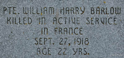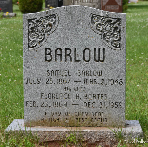 Inscription: BARLOW / Samuel Barlow / July 25, 1867 - Mar. 2, 1948 / His Wife / Florence A. Boates / Feb. 23, 1869 - Dec. 31, 1959 / A day of duty gone / A night of rest begunBack: Pte. William Harry Barlow / Killed in active service / in France / Set. 27, 1918 / Age 22 yrs.[:CR:][:CR:].3  Tombstone, Samuel Barlow (1867-1948), his wife Florence A. Boates (1869-1959), their son William Harry Barlow (1896-1918). Their son is buried in France. Hillside United Church Cemetery, Wellington, Prince County, Prince Edward Island, Canada.  Back inscription.
