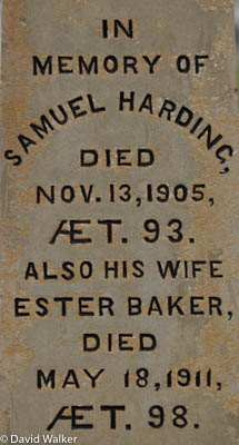 Inscription: In / Memory of / Samuel Harding / Died / Nov. 13, 1905, / ÆT. 93. / Also His Wife / Ester Baker / Died / May 18, 1911, / ÆT. 98.Left: Artemas Harding, / Died / Oct. 7, 1894, / ÆT. 33. / Blessed are the dead / Who die in the Lord.Right: James Harding / 1844 - 1904 / His Wife / Catherine / MacPhee / 1843 - 1925.3  Tombstone, Samuel Harding (c1812-1905), his wife Ester/Hester Baker (c1813-1911), their son Artemas (1861-1894), also their son James (1844-1904), his wife Catherine MacPhee (1843-1925). United Church Cemetery, Summerfield, Queens County, Prince Edward Island, Canada.  Front inscription.  Left inscription.  Right inscription.