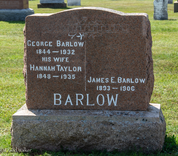 Inscription: George Barlow / 1844 - 1932 / His Wife / Hannah Taylor / 1848 - 1935.3  Tombstone, George Barlow (1844-1932), his wife Hannah Taylor (1848-1935), their son James E. Barlow (1893-1906). United Church Cemetery, Bideford, Prince County, Prince Edward Island, Canada. |