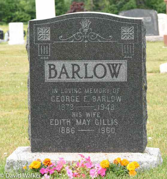 Inscription: BARLOW / In Loving Memory of / George E. Barlow / 1878 - 1948 / His Wife / Edith May Gillis / 1886 - 1960.6,10  Tombstone, George Edmond Barlow (1878-1948), his wife Edith May Gillis (1886-1960). United Church Cemetery, Bideford, Prince County, Prince Edward Island, Canada.