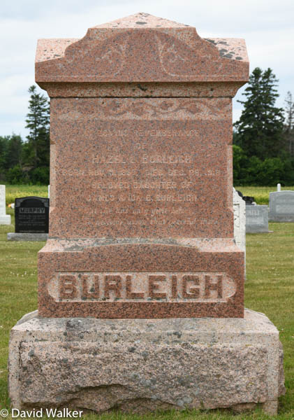 - [S11752] Cemetery Marker, United Church Cemetery, Bideford, Prince County, Prince Edward Island, Canada. John J. Burleigh & Ida E. Barlow, photograph & inscription; read by David A. Walker, 17 July 2016.