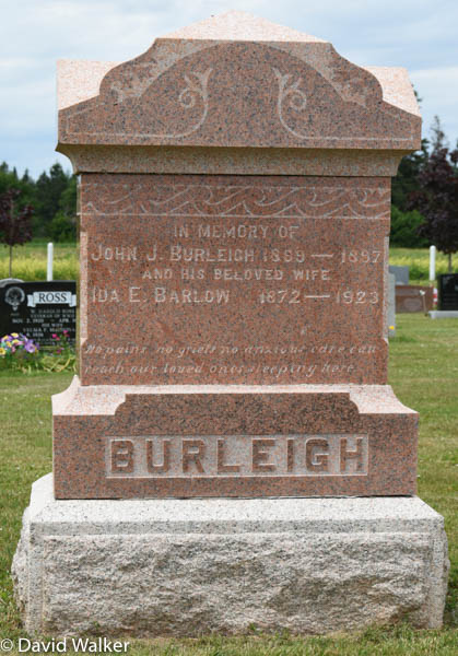 Inscription: In Memory of / John J. Burleigh / 1869 - 1897 / And His Beloved Wife / Ida E. Barlow / 1872 - 1923 / No pains no grief no anxious care can / reach our loved ones sleeping here / BURLEIGH.4  Tombstone, John J. Burleigh (1869-1897), his wife Ida E. Barlow (1872-1923). United Church Cemetery, Bideford, Prince County, Prince Edward Island, Canada.