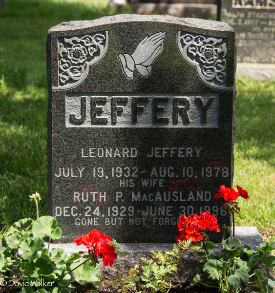 Inscription: JEFFERY / Leonard Jeffery / July 19, 1932 - Aug. 10, 1978 / His Wife / Ruth P. MacAusland / Dec. 24, 1929 - June 30, 1996 / Gone but not forgotten.1,2  Tombstone, Leonard Jeffery (1932-1978), his wife Ruth P. MacAusland (1929-1996). Peoples Cemetery, Summerside, Prince County, Prince Edward Island, Canada.