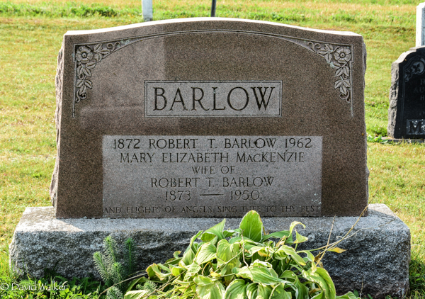 Inscription: BARLOW / 1872 Robert T. Barlow 1962 / Mary Elizabeth MacKenzie / Wife of / Robert T. Barlow / 1873 - 1950 / And Flights of Angels Sing Thee to Thy Rest.6  Tombstone, Robert T. Barlow (1872-1962), his wife Mary Elizabeth MacKenzie (1873-1950). People's Cemetery, Breadalbane, Prince County, Prince Edward Island, Canada.