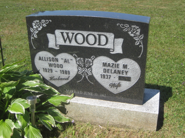 Inscription: WOOD / Allison "Al" / Wood / 1929 - 1989 / Husband | Mazie M. / DeLaney / 1937 - / Wife // Married June 30, 1962.1,3  Tombstone, Allison Wood (1929-1989), his wife Mazie M. DeLaney (1937- ). United Church Cemetery, West Devon, Prince County, Prince Edward Island, Canada.