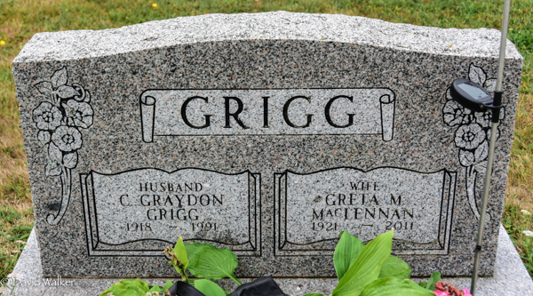 Inscription: GRIGG / Husband / C. Graydon / Grigg / 1918 - 1991 | Wife / Greta M. / MacLennan / 1921 - 2011.1,2  Tombstone, C. Graydon Grigg (1918-1991), his wife Greta M. MacLennan (1921-2011). United Church Cemetery, Tyne Valley, Prince County, Prince Edward Island, Canada.