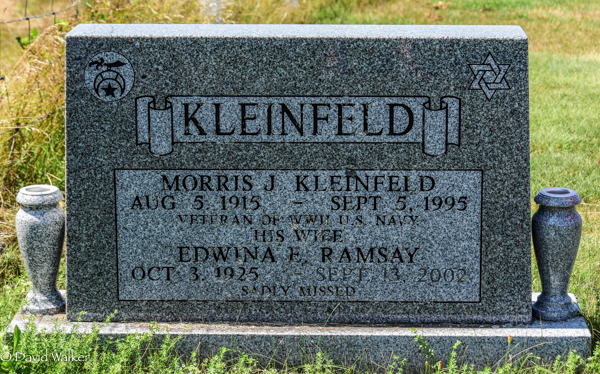 Inscription: KLEINFELD / Morris J. Kleinfeld / Aug. 5, 1915 - Sept. 5, 1995 / Veteran of WWII U.S. Navy / His Wife / Edwina E. Ramsay / Oct. 3, 1925 - Sept. 13, 2002 / Sadly Missed.1  Tombstone, Morris J. Kleinfeld (1915-1995), his wife Edwina E. Ramsay (1925-2002). Peoples / United Church Cemetery, Victoria West, Prince County, Prince Edward Island, Canada.