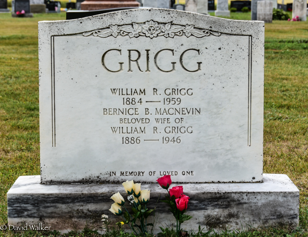 Inscription: GRIGG / William R. Grigg / 1884 - 1959 / Bernice B. MacNevin / Beloved Wife of / William R. Grigg / 1886 - 1946.2,3  Tombstone, William R. Grigg (1884-1959), his wife Bernice B. MacNevin (1886-1946). United Church Cemetery, Bideford, Prince County, Prince Edward Island, Canada.