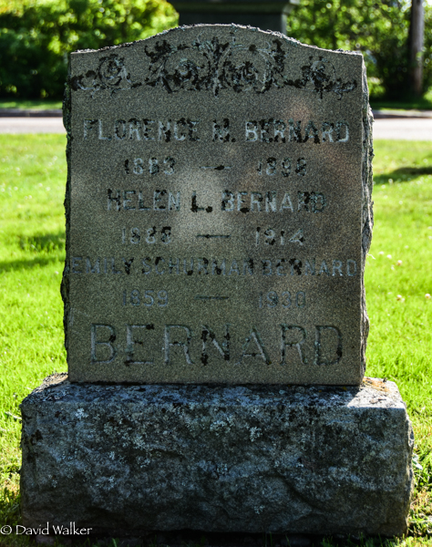 Inscription: Florence M. Bernard / 1883 - 1898 / Helen L. Bernard / 1888 - 1914 / Emily Schurman Bernard / 1859 - 1930 / BERNARD.1  Tombstone, Florence M. Bernard (1883-1898), her sister Helen L. Bernard (1888-1914), and Emily (Schurman) Bernard (1859-1930), second wife of Florence's father. Peoples Cemetery, Summerside, Prince County, Prince Edward Island, Canada.  Footstone, Florence M. Bernard.  Footstone, Helen L. Bernard.