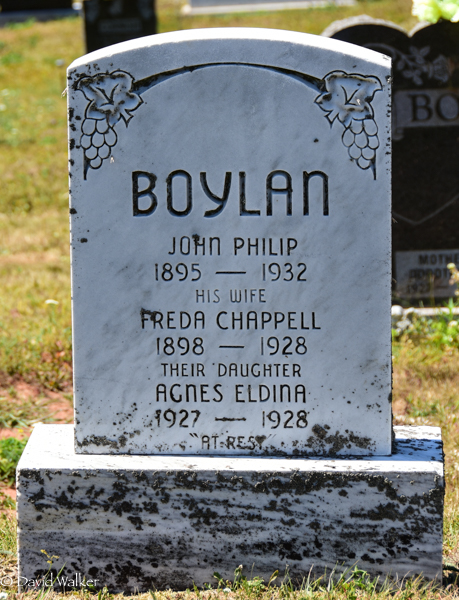 Inscription: BOYLAN / John Philip / 1895 - 1932 / His Wife / Freda Chappell / 1898 - 1928 / Their Daughter / Agnes Eldina / 1927 - 1928 / "At Rest."3,4  Tombstone, John Philip Boylan (1895-1932), his wife Freda Chappell (1898-1928), their daughter Agnes Eldina (1927-1928). United Church Cemetery, Welst Devon, Prince County, Prince Edward Island, Canada.