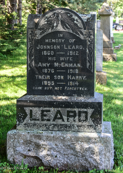 Inscription: In / Memory of / Johnson Leard / 1860 - 1912 / His Wife / Amy M. Enman / 1876 - 1918 / Their Son Harry / 1895 - 1914 / Gone But Not Forgotten.2,3  Tombstone, Johnson L. Leard (1860-1912), his wife Amy M. Enman (1876-1918), their son Harry Leard (1895-1914). United Church Cemetery, Searletown, Prince County, Prince Edward Island, Canada.