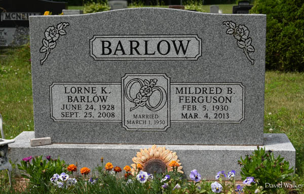 Inscription: BARLOW / Lorne K. / Barlow / June 24, 1928 / Sept. 25, 2008 | Married / March 1, 1950 | Mildred B. / Ferguson / Feb. 5, 1930 / Mar. 4, 2013.2  Tombstone, Lorne K. Barlow (1928-2008), his wife Mildred B. Ferguson (1930-2013). Hillside United Church Cemetery, Wellington, Prince County, Prince Edward Island, Canada.