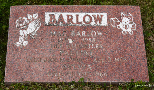 Inscription: BARLOW / Mae Barlow / 1935 - 1988 / Her Daughters / Pauline / Died Jan. 18, 1959 - Age 3 mos. / Sylvia / Died July 17, 1966.2  Tombstone, Mae (Stewart) Barlow (1867-1948), her daughters Pauline (1958-1959) and Sylvia (1966-1966). Hillside United Church Cemetery, Wellington, Prince County, Prince Edward Island, Canada.