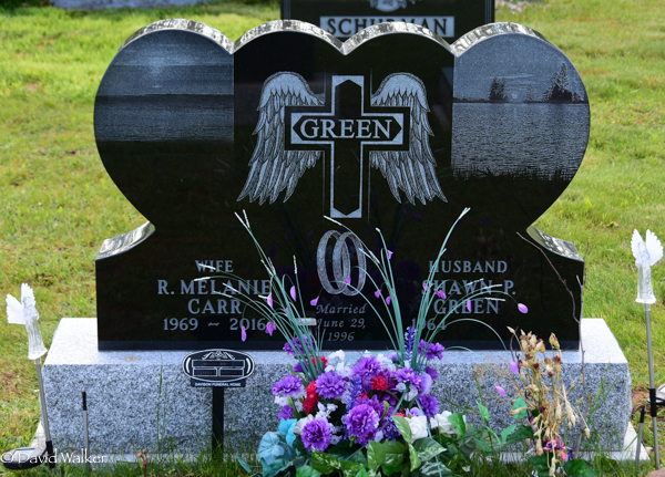 Inscription: GREEN / Wife / R. Melanie / Carr / 1969 - 2016) | Married / June 29, / 1996 | Husband / Shawn P. / Green / 1964 -.1,2  Cemetery marker, R. Melanie Carr (1969-2016), her husband Shawn P. Green (1964- ). Peoples Cemetery, Kensington, Prince County, Prince Edward Island, Canada.