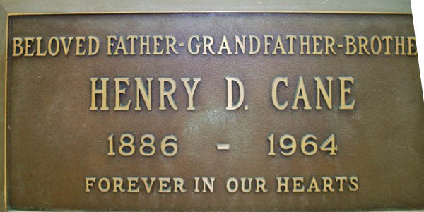 Beth Olam Mausoleum, Hall of Solomon. Inscription: Beloved Father, Grandfather, Brother / Henry D. Cane / 1886 - 1964 / Forever in Our Hearts.5  Tombstone, Henry D. Cane (1886-1964). Hollywood Forever Cemetery, Beth Olam Mausoleum, Hall of Solomon, Hollywood, Los Angeles, California, U.S.A.