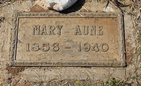 Inscription: Mary Aune / 1856 - 1940.1  Tombstone, Mary Elizabeth (Townsend) Aune (1856-1940). Desert Lawn Cemetery, Yuma, Yuma County, Arizona, U.S.A. Photo courtesy of Chuck O. Fortune.