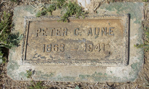 Inscription: Peter C. Aune / 1863 - 1941.1,4  Tombstone, Peter C. Aune (1863-1941). Desert Lawn Cemetery, Yuma, Yuma County, Arizona, U.S.A. Photo courtesy of Chuck O. Fortune.