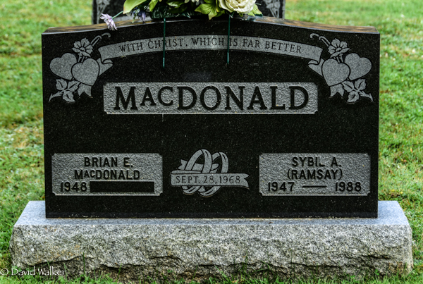 MacDonald / 1948 - | Sept. 28, 1968 | Sybil A. / (Ramsay) / 1947 - 1988.1  Tombstone, Sybil A. Ramsay (1947-1988). Gospel Hall Cemetery, Crapaud, Queens County, Prince Edward Island, Canada.