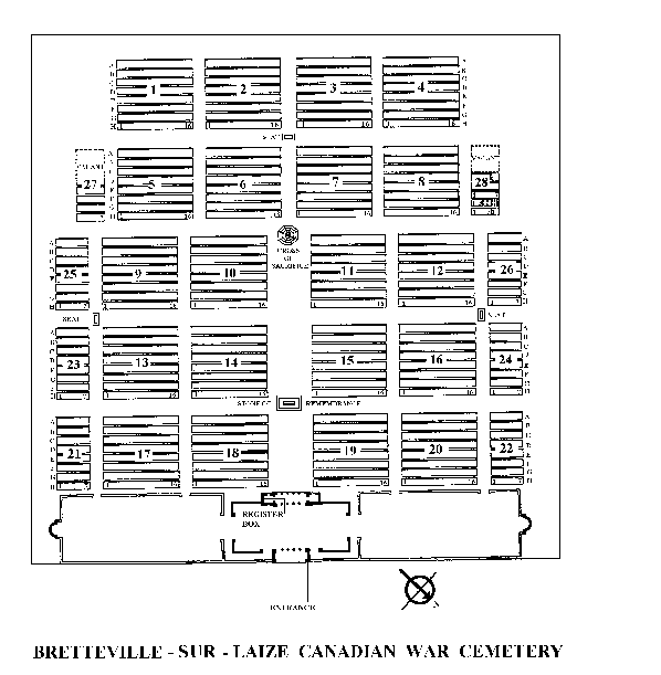 | Burial | He was buried in Bretteville-Sur-Laize Canadian War Cemetery, Calvados, Normandy, FranceG. Grave Reference: III. A. 16. This cemetery lies on the west side of the main road from Caen to Falaise (route N158) and just north of the village of Cintheaux. Bretteville-sur-Laize is a village and commune in the department of the Calvados, some 16 kilometres south of Caen. The village of Bretteville lies 3 kilometres south-west of the Cemetery. Buried here are those who died during the later stages of the battle of Normandy, the capture of Caen and the thrust southwards (led initially by the 4th Canadian and 1st Polish Armoured Divisions), to close the Falaise Gap, and thus seal off the German divisions fighting desperately to escape being trapped west of the Seine. Almost every unit of Canadian 2nd Corps is represented in the Cemetery. There are about 3,000 allied forces casualties of the Second World War commemorated in this site.1 Cemetery Plan, Bretteville-Sur-Laize Canadian War Cemetery, department of the Calvados, Normandy, France. |