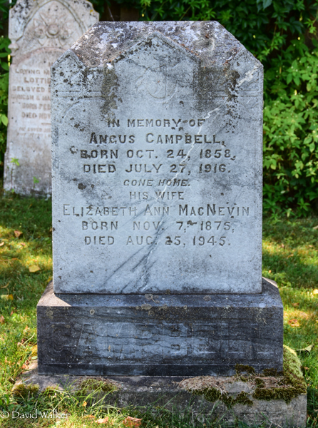 | Principal 2 | She witnessed the burial of Wesley Paynter and Violet E. MacLeod in Geddie Memorial Cemetery, Springbrook, Queens County, Prince Edward Island, Canada, 46.49390, -63.50788G.2,3 Tombstone, Wesley Paynter (1889-1964), his wife Violet E, MacLeod (1891-1930), Donald A. Campbell (1949-1949). Geddie Memorial Cemetery, Springbrook, Queens County, Prince Edward Island, Canada.  Back inscription detail. |