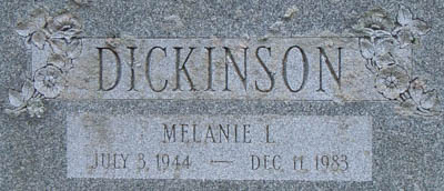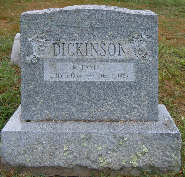 | Burial | She was buried in Pine Grove Cemetery, Topsfield, Essex County, Massachusetts, USAG. Plots 556-743.4 Tombstone, Melanie Louise (Jamieson) Dickinson (1944-1983). Pine Grove Cemetery, Topsfield, Essex County, Massachusetts, U.S.A. Photo courtesy of Karen Watson, findagrave.com.  Inscription detail. |
