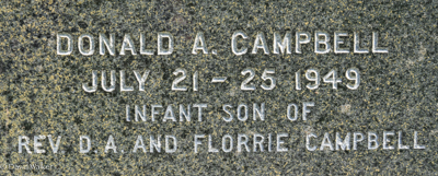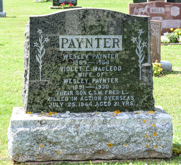 Inscription: PAYNTER / Wesley Paynter / 1889 - 1964 / Violet E. McLeod / Wife of / Wesley Paynter / 1891 - 1930 / Their Son C.S.M. Fred L. / Killed in Action Overseas / July 25, 1944. Aged 21 Yrs.Back: Donald A. Campbell / July 21 - 25, 1949 / Infant son of / Rev. D. A. and Florrie Campbell (the Campbell connection is not known.)2,3  Tombstone, Wesley Paynter (1889-1964), his wife Violet E, MacLeod (1891-1930), Donald A. Campbell (1949-1949). Geddie Memorial Cemetery, Springbrook, Queens County, Prince Edward Island, Canada.  Back inscription detail.