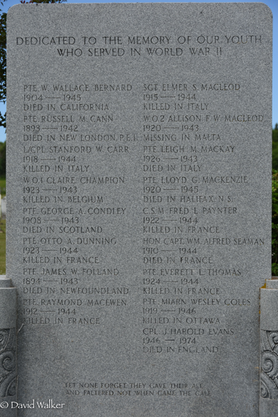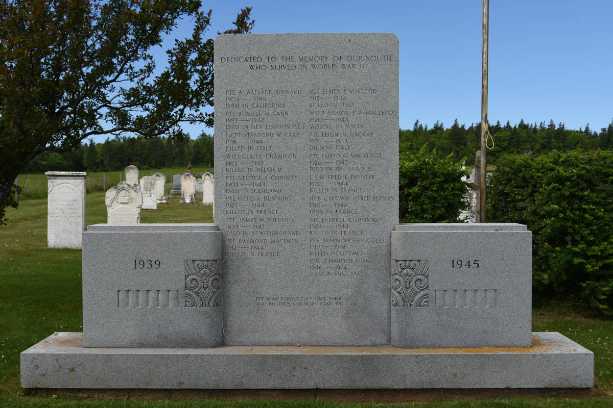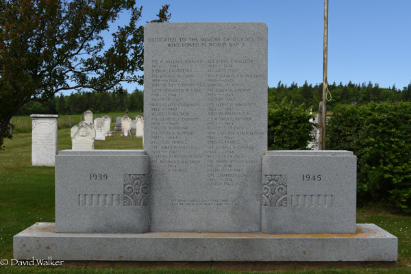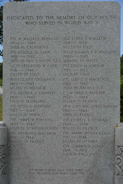 | Death | He died on 25 July 1944. he was killed in action overseas, during World War II.2 Book of Remembrance, page 413. Photo courtesy of the Canada Dept. of Veterans Affairs.  World War II Memorial. Geddie Memorial Cemetery, Springbrook, Queens County, Prince Edward Island, Canada.  Inscription details. |