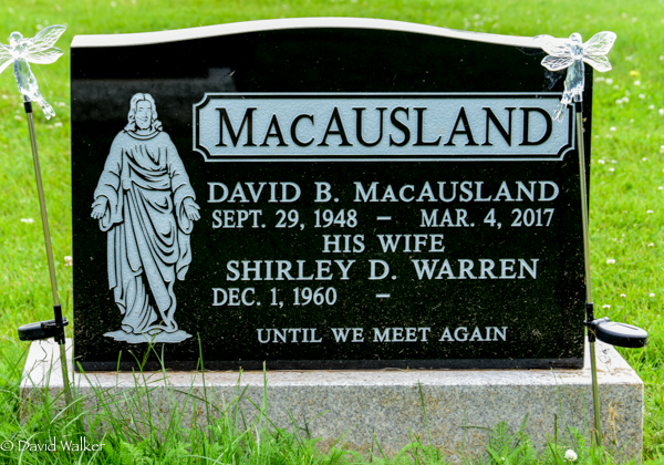 Inscription: MacAUSLAND / David B. MacAusland / Sept. 29, 1948 - Mar. 4, 2017 / His Wife / Shirley D. Warren / Dec. 1, 1960 - / Until we meet again.1,2  Tombstone, David B. MacAusland (1948-2017), his wife Shirley D. Warren (1960- ). Peoples Cemetery, Summerside, Prince County, Prince Edward Island, Canada.