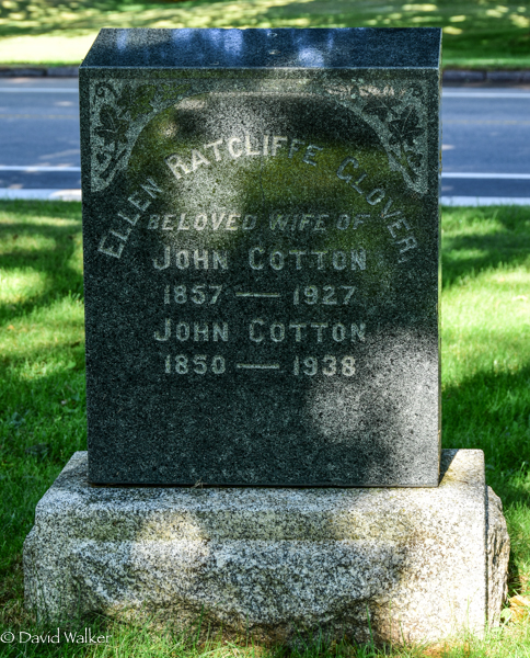 Inscription: Ellen Ratcliffe Glover / Beloved Wife of / John Cotton / 1857 - 1927 / John Cotton / 1850 - 1938Back: COTTON.2,4  Tombstone, John Cotton (1850-1938), his wife Ellen Ratcliffe Glover (1857-1927). St. John's Anglican Cemetery, St. Eleanors , Prince County, Prince Edward Island, Canada.