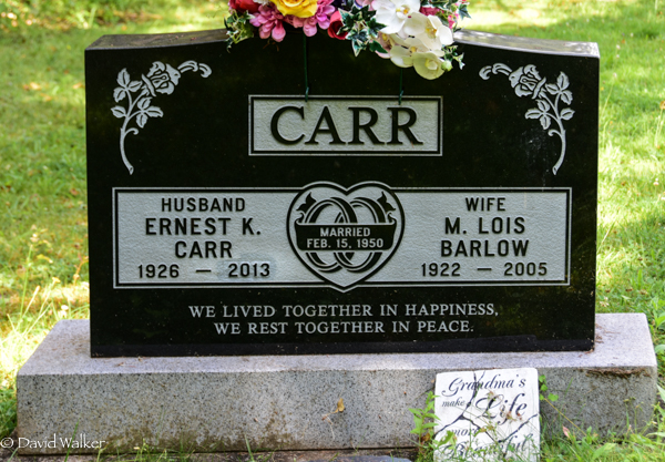 Inscription: CARR / Husband / Ernest K. / Carr / 1926 - 2013 | Married / Feb. 15, 1950 | Wife / M. Lois / Barlow / 1922 - 2005 // We lived together in happiness, / We rest together in peace.4  Tombstone, Ernest K. Carr (1926-2013), his first wife M. Lois Barlow (1922-2005). Hillside Cemetery, Wellington, Prince County, Prince Edward Island, Canada.