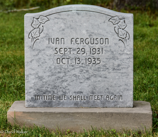 Inscription: Ivan Ferguson / Sept. 29, 1931 / Oct. 13, 1935 / In Time We Shall Meet Again.2,4  Tombstone, Ivan Ferguson (1931-1935). Presbyterian Church Cemetery (old section), Tyne Valley, Prince County, Prince Edward Island, Canada.