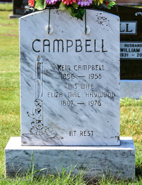 Inscription: CAMPBELL / Keir Campbell / 1896 - 1955 / His Wife / Eliza Mae Haywood / 1897 - 1976 / At Rest.3  Tombstone, Keir Campbell (1896-1955), his wife Eliza Mae Haywood (1897-1976). Hillcrest Cemetery, Alberton, Prince County, Prince Edward Island, Canada.