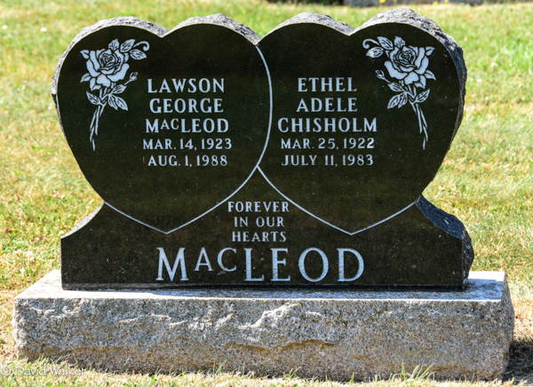 Inscription: Lawson / George / MacLeod / Mar. 14, 1923 / Aug. 1, 1988 | Ethel / Adele / Chisholm / Mar. 25, 1922 / July 11, 1983 // Forever / in our / hearts / MacLEOD.1,3  Tombstone, Lawson George MacLeod (1923-1988), his wife Ethel Adele Chisholm (1922-1983). Presbyterian/United Cemetery, North Bedeque, Prince County, Prince Edward Island, Canada.