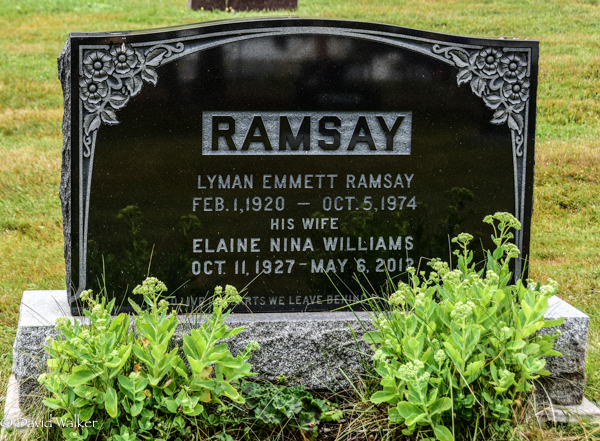 Inscription: RAMSAY / Lyman Emmett Ramsay / Feb. 1, 1920 - Oct. 5, 1974 / His Wife / Elaine Nina Williams / Oct. 11, 1927 - May 6, 2012.1,3  Tombstone, Lyman Emmett Ramsay (1920-1974), his wife Elaine Nina Williams (1927-2012). Presbyterian Church Cemetery, Tyne Valley, Prince County, Prince Edward Island, Canada.