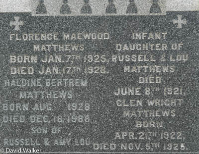 Inscription: In Loving Memory of / Archibald Matthews / Born 1853 - Died 1932 / Angeline Betts / Wife of / Archibald Matthews / Born 1856 - Died 1923. / Russell Matthews / Born 1893 - Died 1952 / His Wife Amy Lou Ramsay / Born 1897 - Died 1966 / MATTHEWSLeft: Elsie R. / Matthews / Wife of / Henry Moreshead / Died May 18, 1916 / Aged 29 Yrs.Back: Florence Maewood / Matthews / Born Jan. 7th, 1925, / Died Jan. 17th, 1928. / Haldine Bertrem / Matthews / Born Aug. 1928 / Died Dec. 18, 1988 / Son of / Russell & Amy Lou.1  Tombstone, Archibald Matthews (1853-1932), his wife Angeline Betts (1856-1923), their children Elsie R.Matthews (1893-1952) & Russell Matthews (1893-1952), his wife Amy Lou Ramsay (1897-1966), their children Florence Maewood (1925-1928), Haldine Bertrem (1928-1988), infant daughter (-1921), Glen Wright Matthews (1922-1925). Hillcrest Cemetery, Alberton, Prince County, Prince Edward Island, Canada.  Left inscription.  Back inscription. |