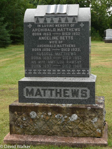 - [S11771] Cemetery Marker, Hillcrest Cemetery, Alberton, Prince County, Prince Edward Island, Canada. Archibald Matthews family plot, photograph & inscription; read by David A. Walker, 28 July 2016.