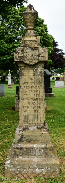 Inscription: In / Memory of / Eleanor Hall / Wife of / The Late / Alex Waugh / Died / Feb. 5, 1890 / ÆT. 93.Left: Samuel Waugh / Died / Feb. 25, 1909 / ÆT. 81Back: In / Memory of / Mary Stavert / Wife of / Samuel Waugh / Died Dec. 28, 1867 / ÆT. 37 / Also their son / Brewer / Died Mar. 3, 1895 / ÆT. 31.4  Tombstone, Eleanor Hall (1797-1890), her son Samuel (1828-1909). his wife Mary Stavert (1830-1867), their son Brewer (1864-1895). Peoples Cemetery, Summerside, Prince County, Prince Edward Island, Canada.  Front inscription detail.  Left inscription detail.  Back inscription detail.